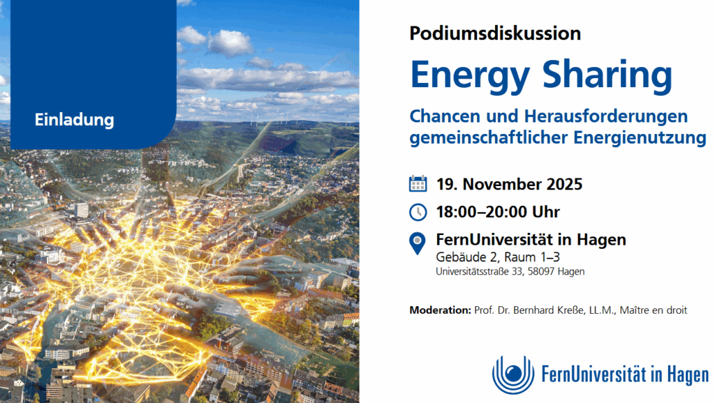 - Podiumsdiskussion Energy SharingMit dem „Energy Sharing“ soll eine aktive Teilnahme an der Energiewende ermöglicht werden, indem lokal erzeugte Energie gemeinsam verbraucht oder mit den Nachbarn geteilt wird, zum Beispiel in einem Haus oder einer Straße. Die Idee ist, dass hierdurch die Nutzung von Solarstrom in den Gemeinden vereinfacht und das Stromsystem flexibilisiert wird. Podiumsdiskussion am 19. November 2025, 18–20 Uhr an der FernUniversität in Hagen Weiterlesen …